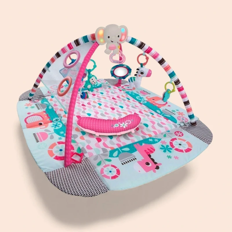 De gym is opgebouwd rond een klassiek 'activity gym'-concept met een speelboog. De roze kleur en de 'Ball Play' naam suggereren een focus op visuele prikkels en balvaardigheden.